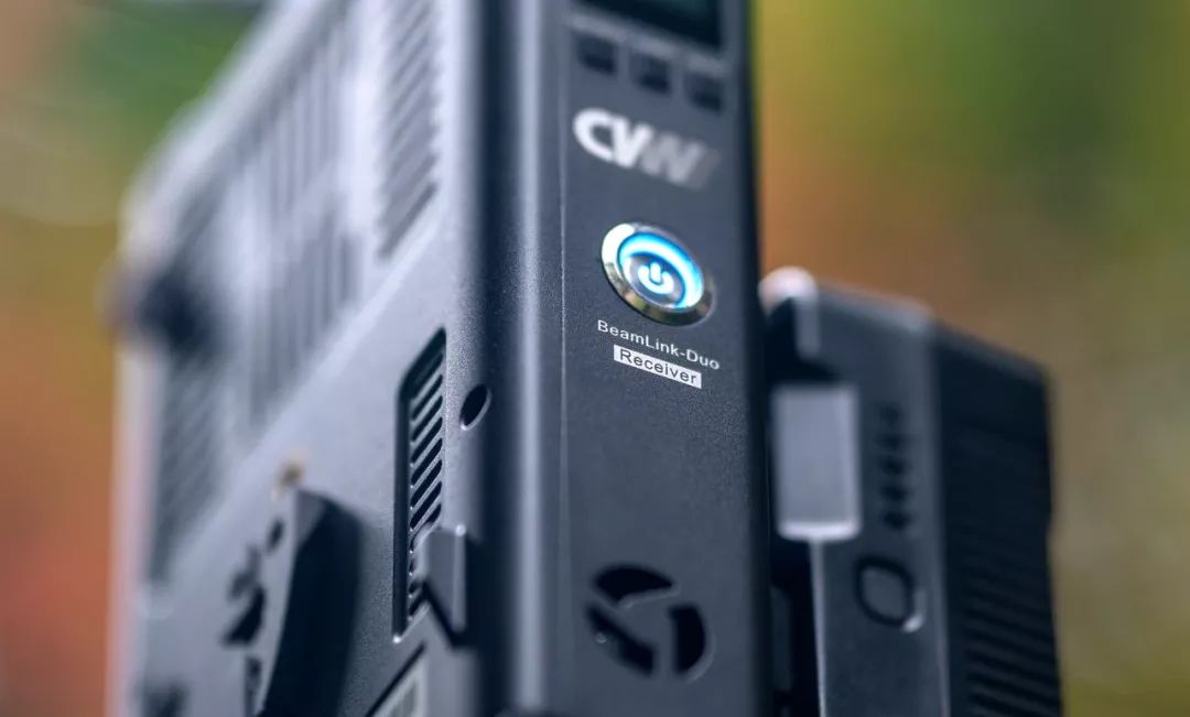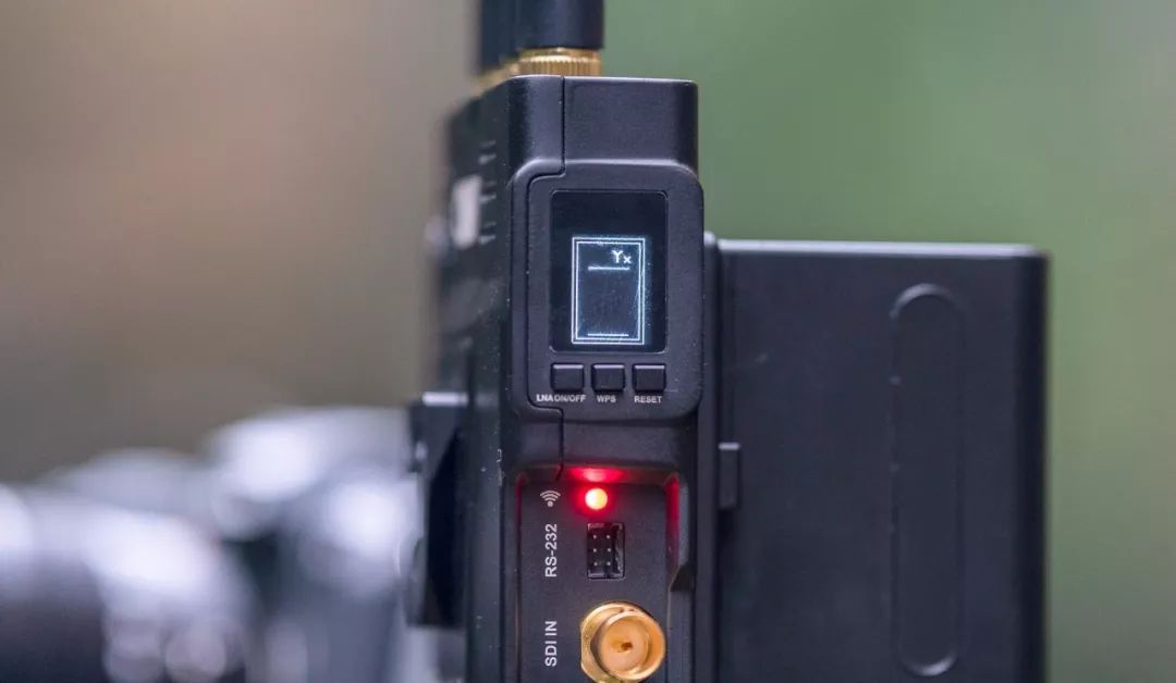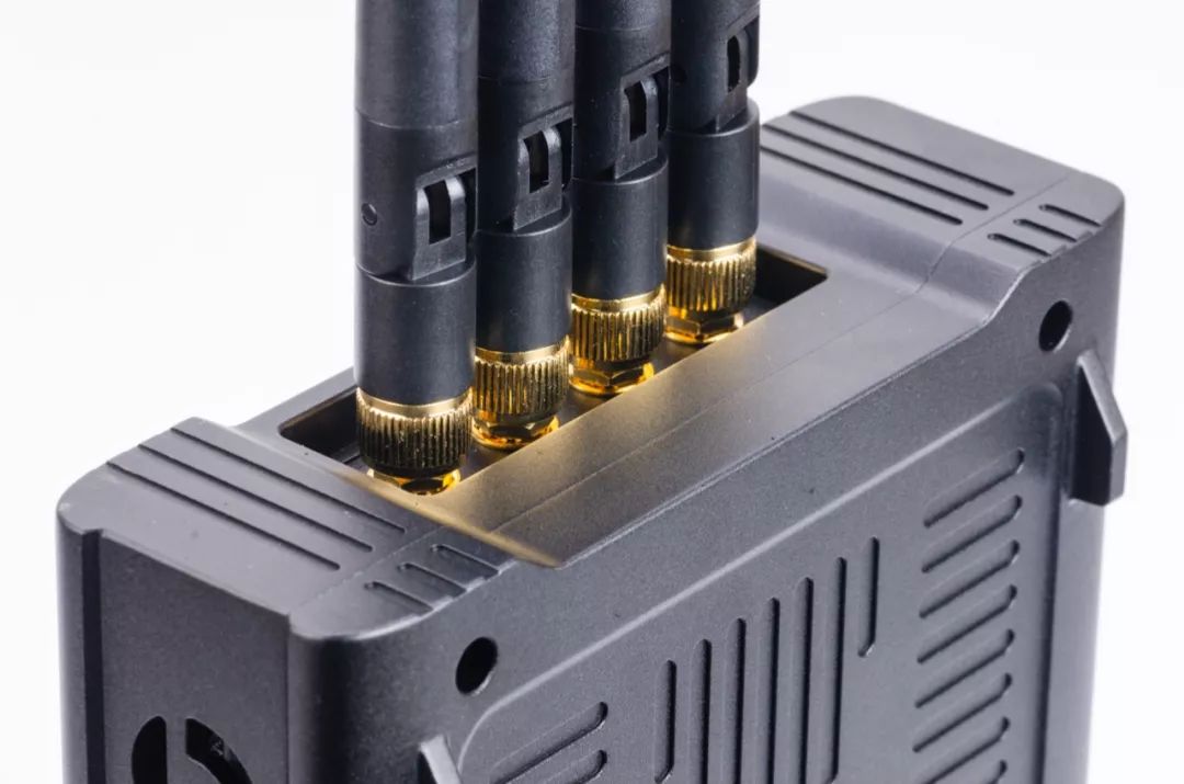接收器的外观造型比普通点对点无线图传的大许多,体积扩大主要是因为双路接收、Tally与RS232功能需要更多的模块与器件。它机身配备了四根天线,开关按钮采用按压式,在开机时按钮半凹进机身内,很大程度的避免了误触。