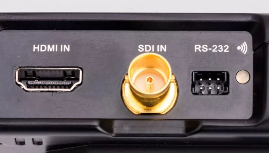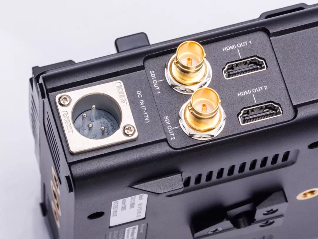 机身一侧有HDMI和SDI输入接口,另一侧则是电源输入,开关及Tally输出接口。各项功能都具备,非常直观,但是缺少了视频信号环出接口,一些小型设备只具有一个HDMI信号输出接口,若是在外接图传的同时还想外接小监视器,则无法实现。