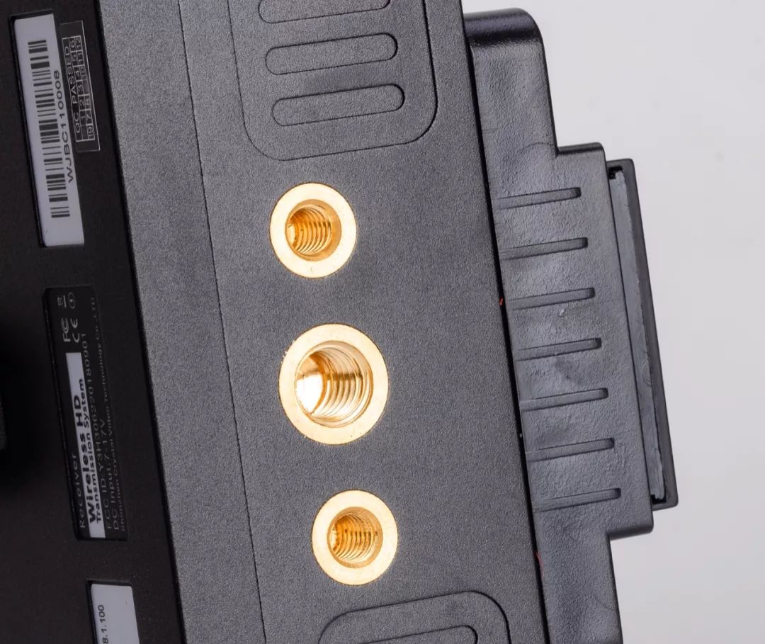 我们知道,接收器需要架至较高处才能发挥接收的最大功效,所以一般都会放置在灯架上,这时候需要一到两个螺孔。该机下方提供2个1/4螺孔,1个3/8螺孔,绰绰有余!