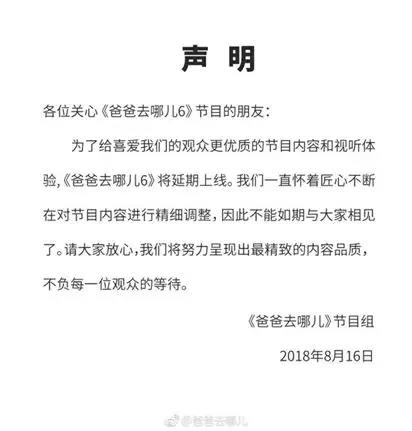 这档时乖运拙的亲子类综艺自第四季开始,就被流出“停录”、“停播”等传言。第六季又在今年暑期录制中途更换嘉宾,8月,节目组发布节目延期的声明,却对具体播出日期只字未提,至今没有任何后续。