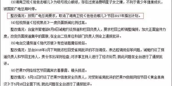 去年8月,湖南省纪委、湖南省监察厅官方网站“三湘风纪网”《中共湖南广播电视台委员会关于巡视整改情况的通报》中,特意提到《爸爸去哪儿》存在过度消费明星子女之嫌,节目也被国家广电总局叫停。之后节目取消台播,改为由芒果TV和优酷联合开播;
