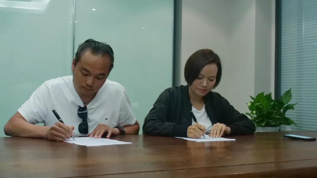白沙影业负责人彭姗(右)和张智超(左)签约现场