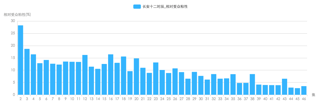 而《长安》的受众粘性下滑更是断崖式的。根据云合数据显示,《长安十二时辰》的受众粘度在开播时高达28.22%,而同天开播的《陈情令》受众粘性度为26.71。但一天后《长安》的受众粘度已经掉到了18.66,下跌率高达33%。