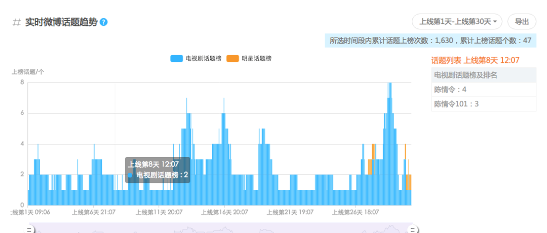 《长安》在上线第1天~第30天的实时微博热搜趋势和实时微博话题趋势排布,日渐稀疏。特别是这两项数据与《陈情令》做对比时,《长安》的话题度就更显惨淡了。