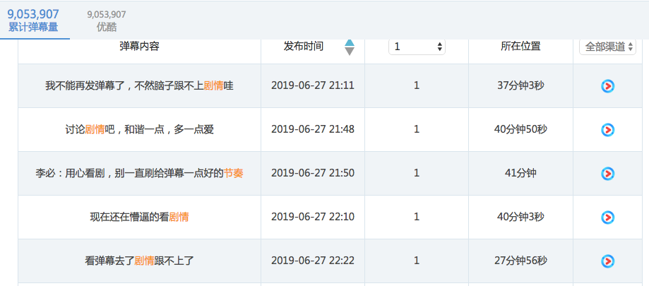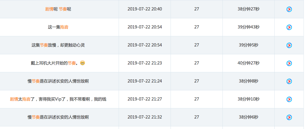 从上图可以看出,在27集时,《长安》的弹幕画风已经变成了,“剧情呢 节奏呢”“这一集很拖沓”类似。