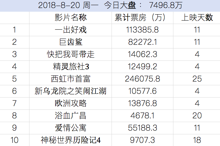《一出好戏》目前已经超过了11亿,《巨齿鲨》内地8亿,全球票房已经超过了3亿(美金)。他们续航能力超强。