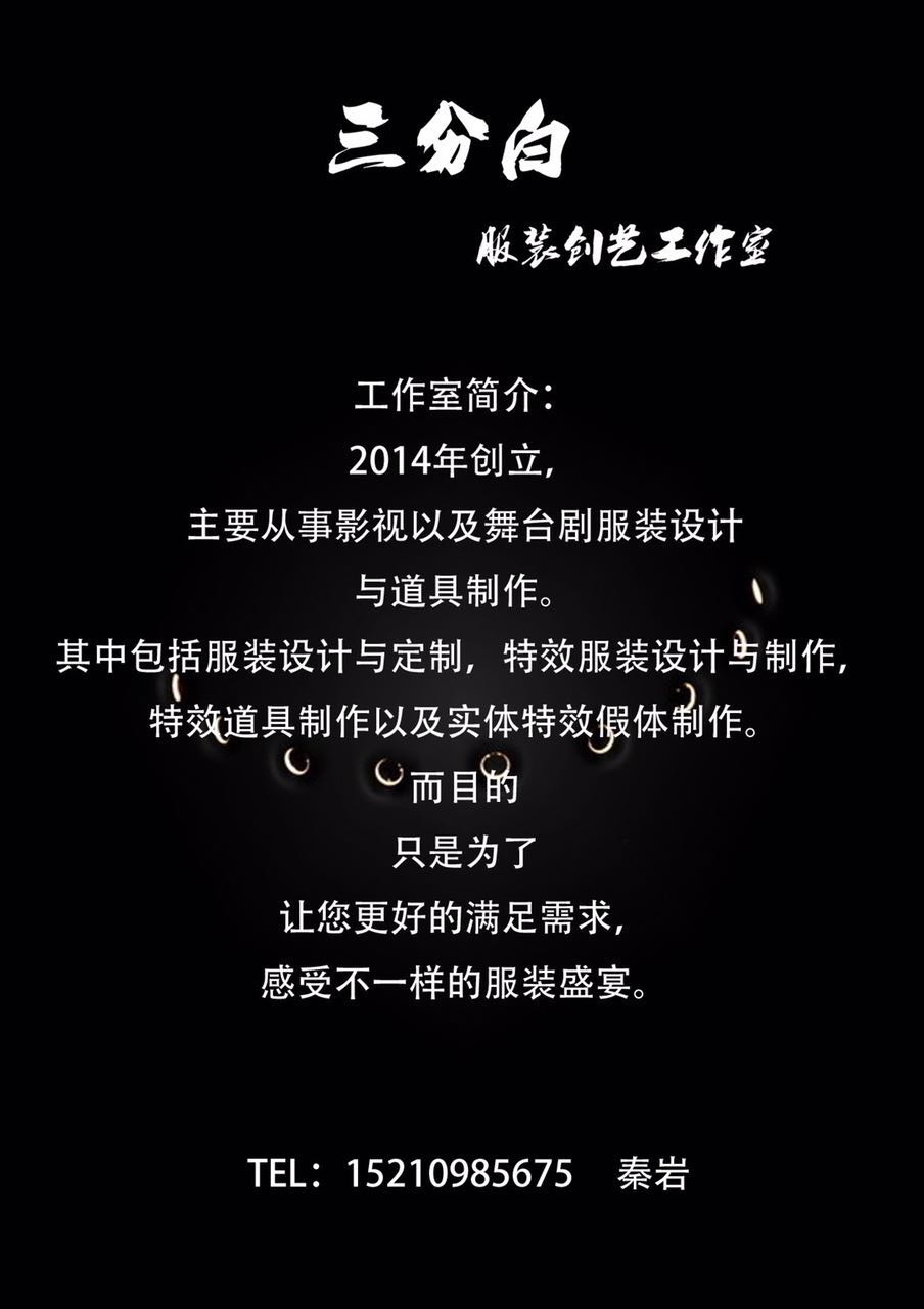 三分白服装创艺工作室,主营影视服装、影视道具、特效化妆的定制。 剧本定制、图纸定制等皆可,欢迎私信了解更多信息。 微信公众号:Thite2014 谢谢关注