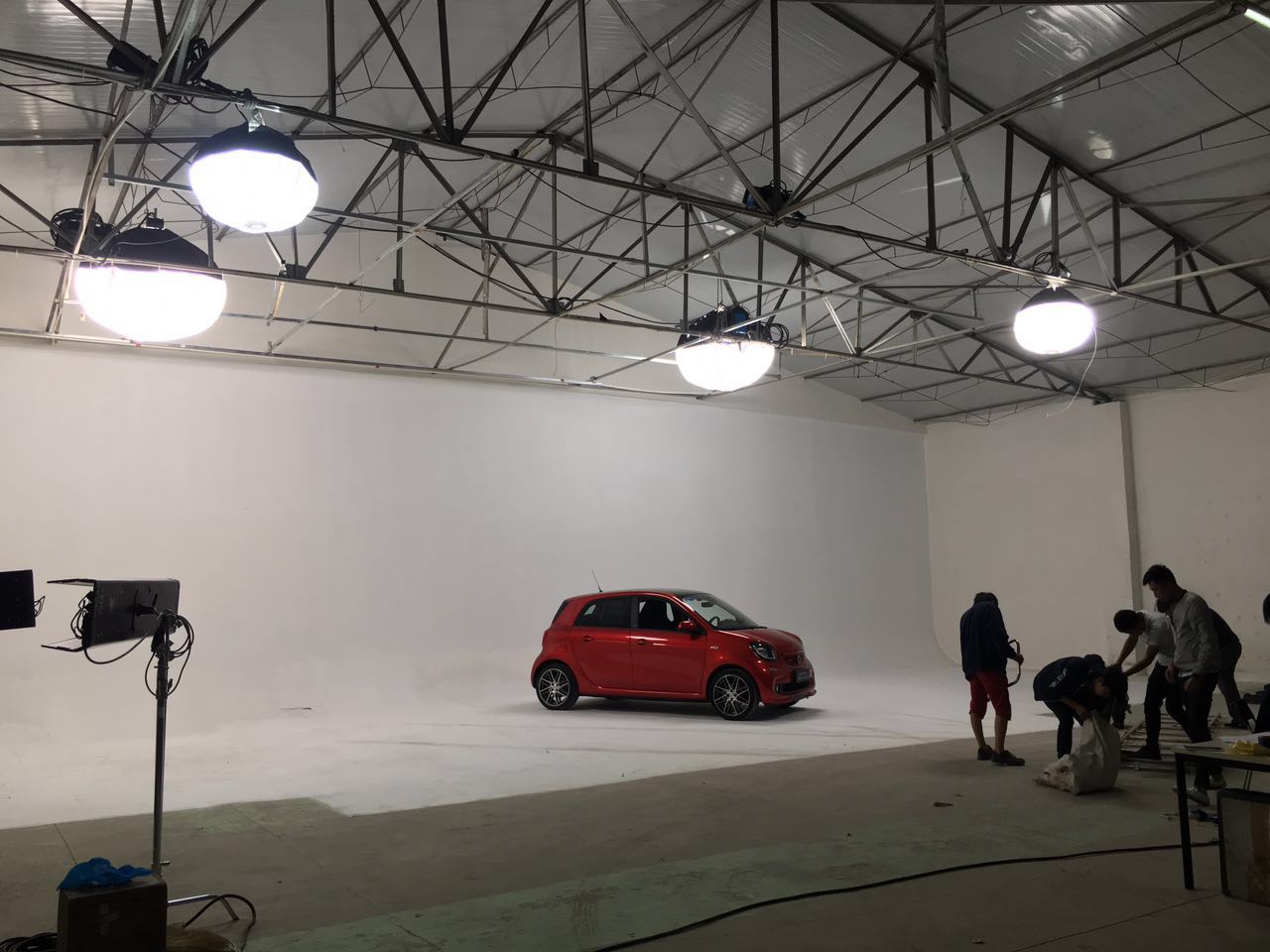 影棚使用面积600平米,层高7米。拍摄区宽26米,长21米。配备电影聚光灯、三基色灯、红头灯、魔术腿、蝴蝶布、绿布、蓝布,白色无影墙。