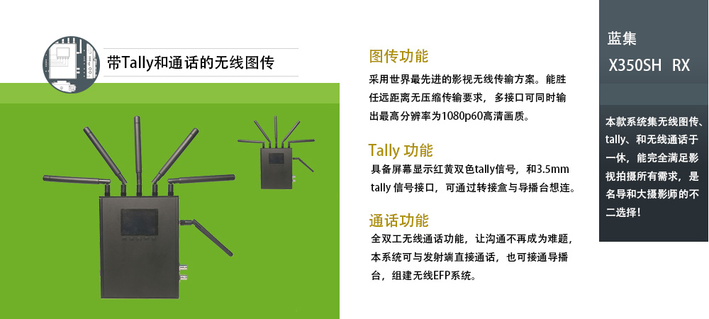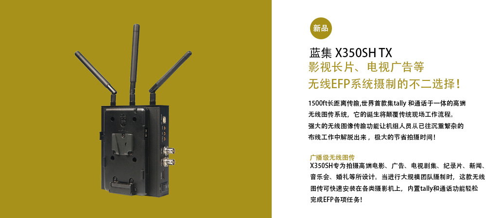 深圳蓝集科技有限公司研发生产型公司,专注于电影电视拍摄用高清无线图传设备的研发制作,目前在售产品有高清无线图传、高清无线讯道EFP带通话和tally、高清无线监看 三类目产品。王先生 15914538608(0755-29079700)