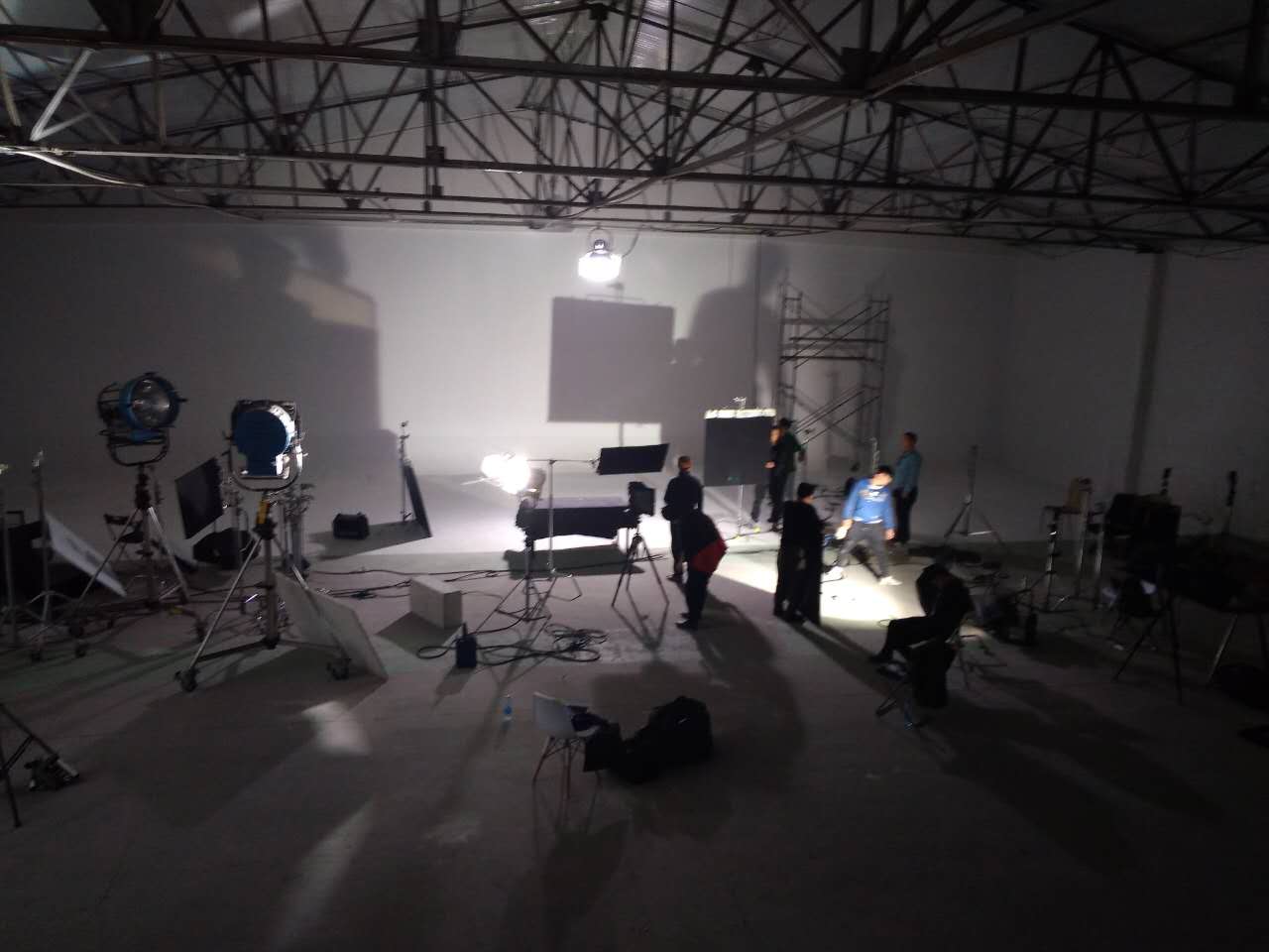 影棚使用面积600平米,层高7米。拍摄区宽26米,长21米。配备电影聚光灯、三基色灯、红头灯、魔术腿、蝴蝶布、绿布、蓝布,白色无影墙。