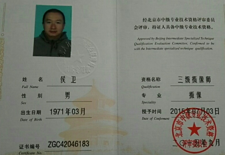 现任北京电视台社会新闻采访部摄像师(摄像师中级职称)。