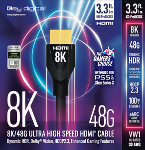 Key Digital推出了新款KD-Pro8K3BX,KD-Pro8K6BX,KD-Pro8K10BX 8K 48G超高速认证HDMI线,长度分别为3英尺(0.9m),6英尺(1.8m)和10英尺(3m)。这个先进的电缆系列具有