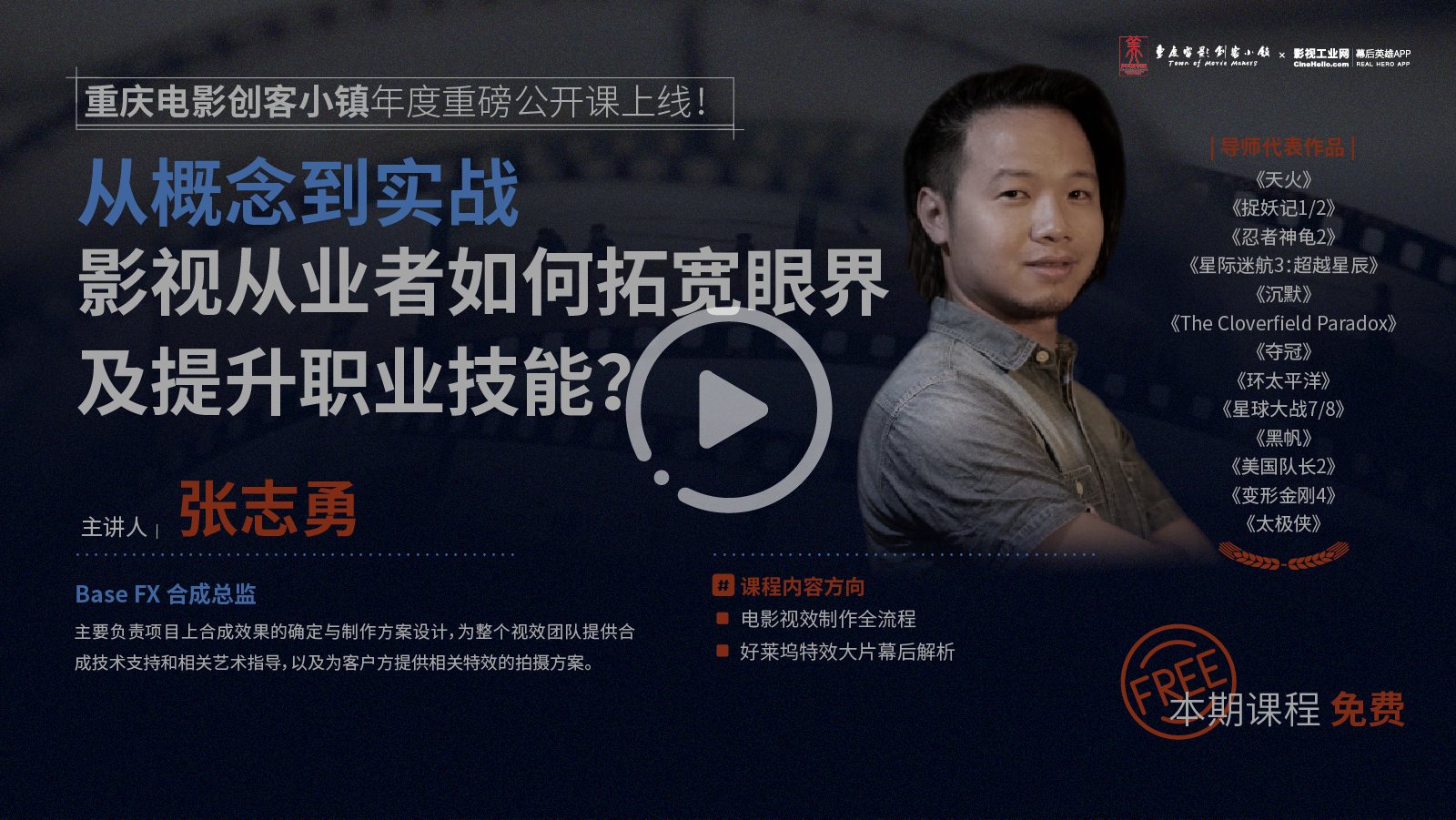 [ 影视工业网 x美电传媒 ]重庆电影创客小镇年度重磅公开课上线!本期课程主讲人:王彧、张志勇(课程共2集 均可免费观看)从概念到实战,影视从业者如何拓宽眼界及提升职业技能?由影视工业网与美电传媒共同打造的#重庆电影创客小镇