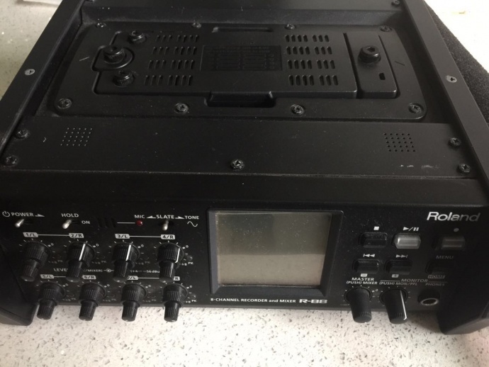 Roland r88录音机一台(一路卡农头卡子掉了,可以用其他7路,不影响操作)416话筒两根95新,防风三件套(两套)AKAR话筒杆4米一根5米一根 PETROL背带95新 还有线材若干条,拍戏这些基本够用了。整套价格35000 可小刀有