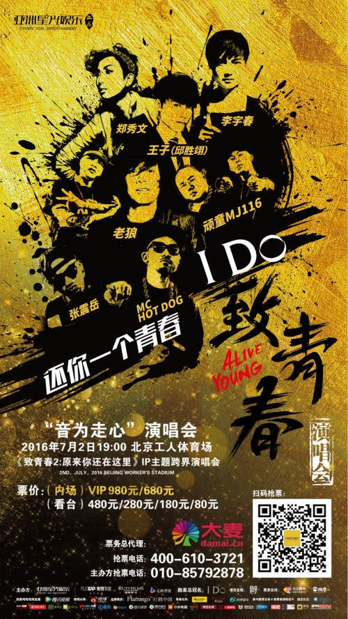 2016年7月2日,由亚洲星光娱乐主办的“I Do致青春”音为走心演唱会即将在北京工人体育场震撼上演。首发阵容郑秀文、李宇春、老狼、张震岳、MC Hotdog、顽童MJ116、王子(邱胜翊)已正式亮相,而据主办方透露,《致青春2:原来你还在