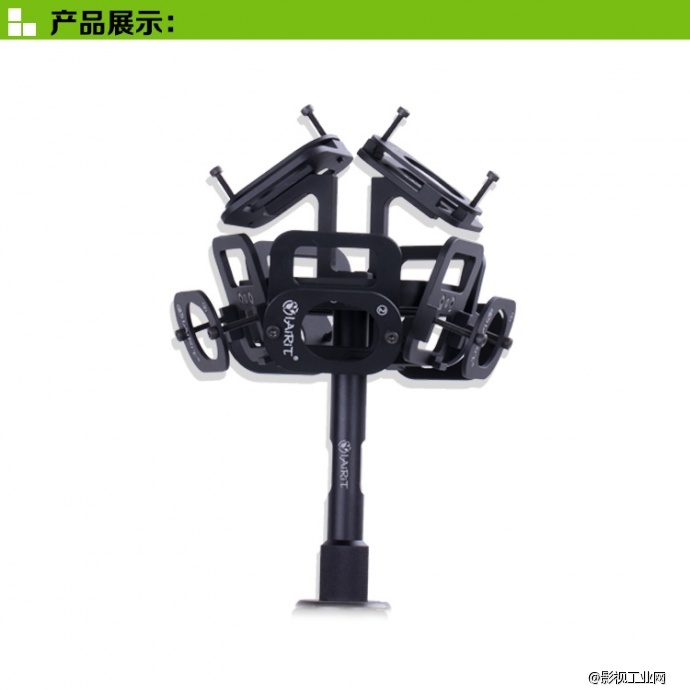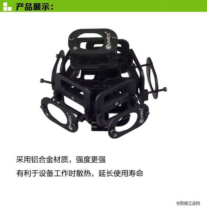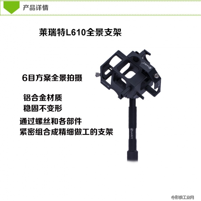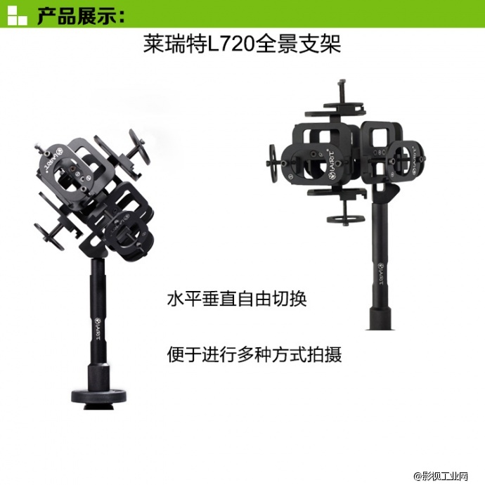 莱瑞特L720全景支架 :是L700系类的完整升级版。能拍摄全景无死角画面,有两种使用状态。一种使用状态是在陆地上时,另一种则是在空中悬挂的。 在陆地上的使用转台又因为转接头而有两种不同的形式,一种是横放框架,这样拍摄的话,拍到的杆子会占用