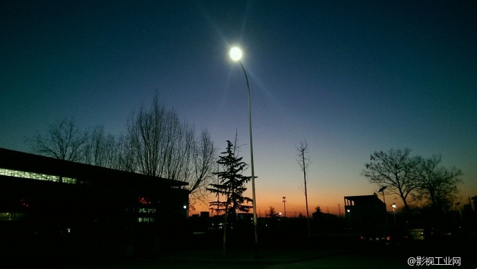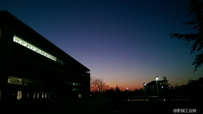 傍晚五点多钟的图书馆,太阳刚刚落下,天边还泛着橘红色的余晖。天空没有完全黑下来,蓝天变得深蓝,开始慢慢变成黑色。整幅图片的色彩十分鲜明,层次分明,处理得恰到好处。图片中的路灯是整幅图片的亮点,孤零零的路灯伸得很高,路灯杆儿仿佛融