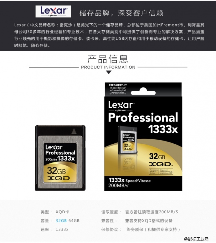 雷克沙Lexar 1333X 200MB/S 32G XQD存储卡