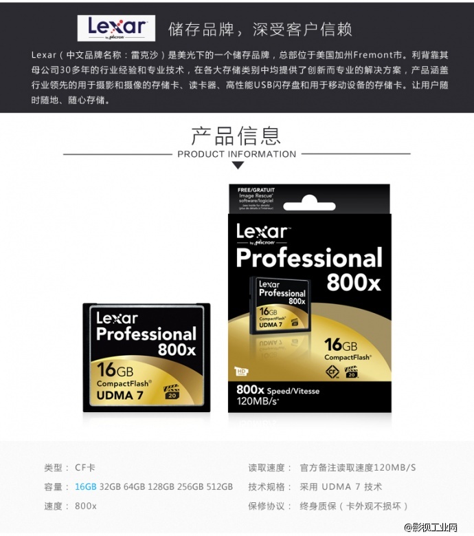 雷克沙Lexar 800x 120M/S CF16G存储卡