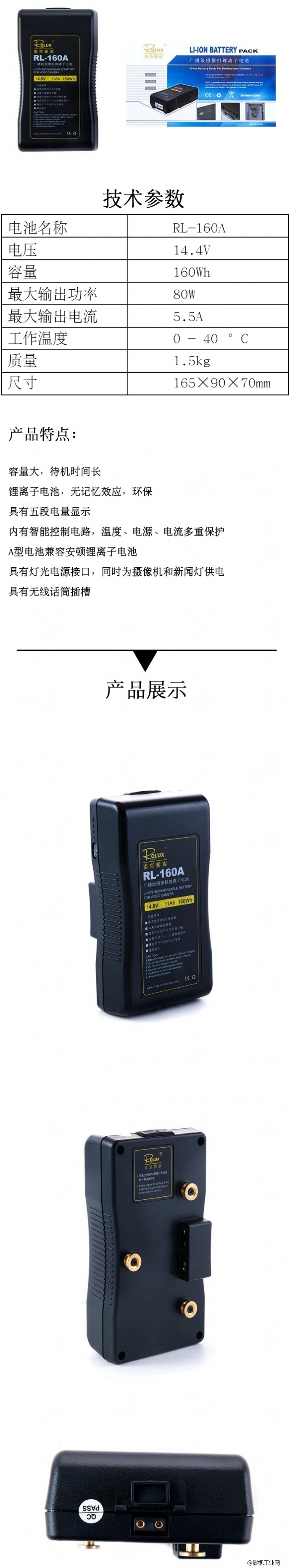 电压:14.8V 容量:11Ah 160Wh 重量:1000g 外形尺寸:163(高)*49(厚)*88(宽)mm 工作环境温度:-10℃~+45℃ 包装材质:纸盒 容量大,待机时间长 锂离子电池,无记忆效应,环保 具有五段电量显示