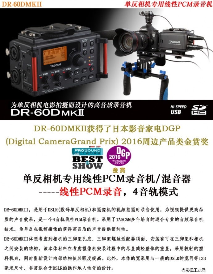 日本 TASCAM DR-60DmkII 第二代单反专用录音机,新品上市,原价2550元,现只售1700元。 购买请点击影视工业网商城:http://107cine.com/mall/product/1273/ [flash]http:/