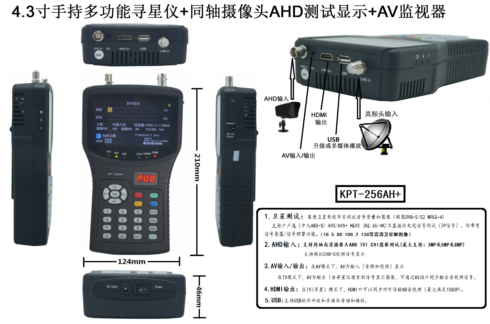 KPT-256AH+ (S2+AHD+AV)4.3寸手持16:9宽屏多功能寻星仪/监视器(高清中文版本) ¤4.3寸高清TFT LCD宽屏显示屏,支持高清卫星信号显示信号质量和图像(DVB-S/S2 MPEG