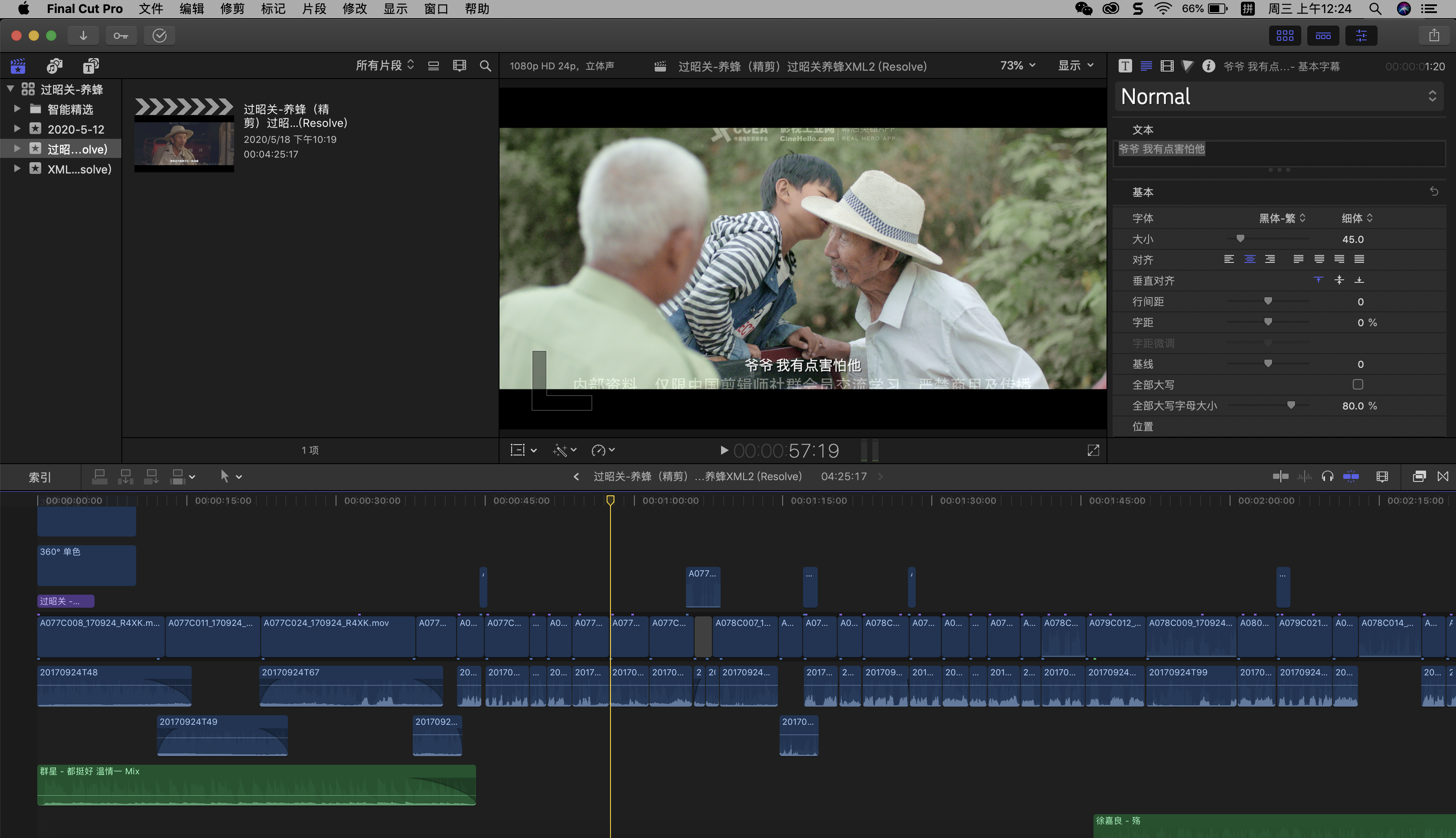 剪辑软件Final Cut Pro X调色软件DaVinci Resolve 16因为之前有看过这个电影和听过霍猛导演的分享,所以在拿到素材的时候,为了不被影响有自己的一个剪辑思路,我通过反复看素材,在破碎的素材中重新组建自己的思路。拿到素