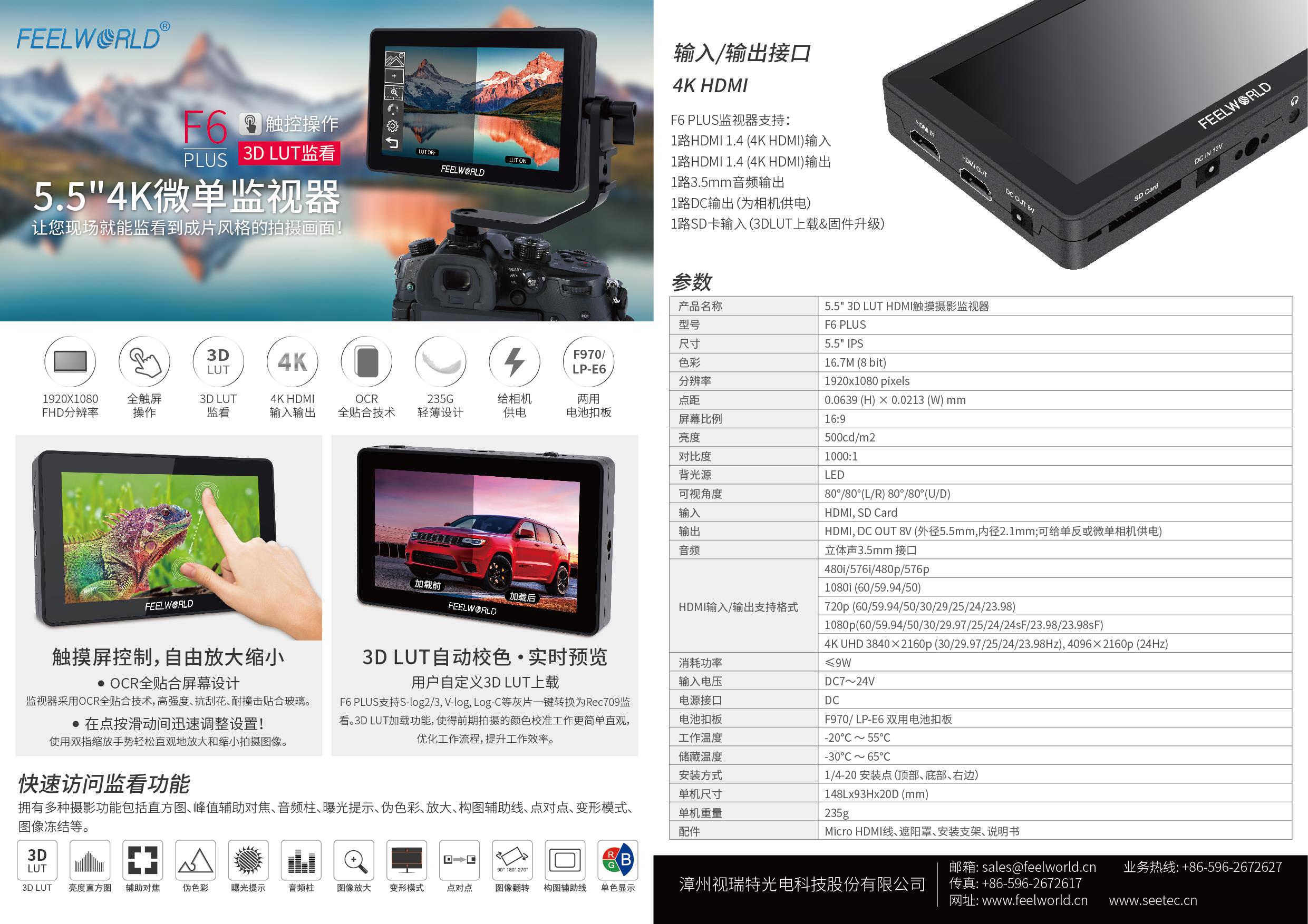 富威德F6Plus 5.5寸触摸监视器3D-lut单反摄影微单4K高清HDMI外接手持稳定器视频显示器