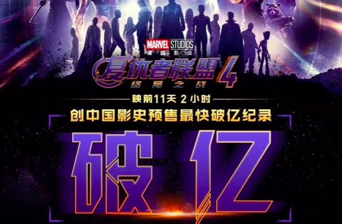 昨天,我们影视工业网第一时间报道了《复联4》内地影院今天开启预售的消息,果不其然言中了。(点击阅读)根据猫眼专业版数据,截至目前《复联4》内地预售首日票房已破亿(还有些影院没开票)。映前11天2小时,《复联4》创造中国影史预售最快破亿纪录。