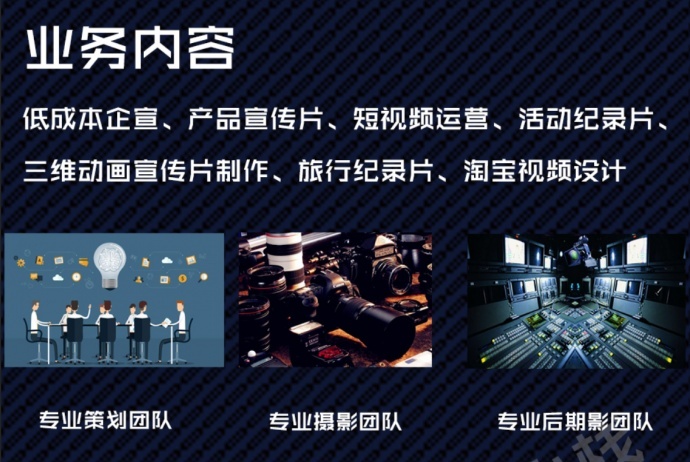 在这个信息网络横行的时代,视频呈现对比图文更加吸引人的注意,您可有一部属于自己并且能够展现贵公司产品特色的宣传短片?或许对于中小型企业来讲一部十几万的片子可能会让人望而止步,为此,本公司(广州摄影小栈文化传媒有限公司)特地为中小型企