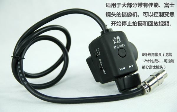 控制功能:变焦、录停、推拉、回放。 变焦速度可能过指压按钮调节,用途广泛,可夹固于三脚架手柄、插入镜头即可。独脚架、稳定器和其它类似设备上,只需将8芯连接线