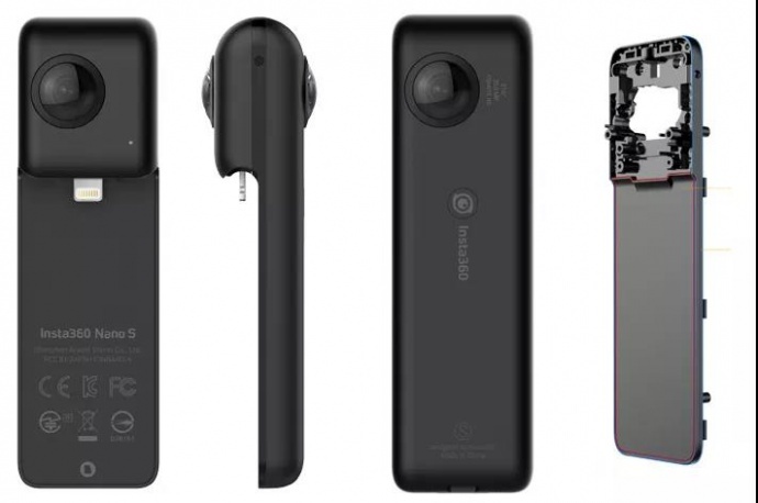 知名VR全景相机品牌Insta360发布的消费级4K超高清新品Nano S。该相机可适配iPhone,即插即拍,可实现4K超高清全景视频、2000万像素全景照片、全景直播、360°全景视频通话、画中画(MultiView)、手机自由剪辑(F