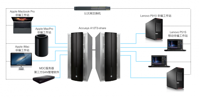 随着4K摄影机的普及,越来越多的视频后期制作企业及个人都在寻找可满足4K编辑的主机和存储系统。由于4K的素材量远远大于标清和高清,因此存储系统的容量需求也不断攀升。 目前企事业单位很多还局限于单机非编系统的应用下,一台非编主机连接一台非编存