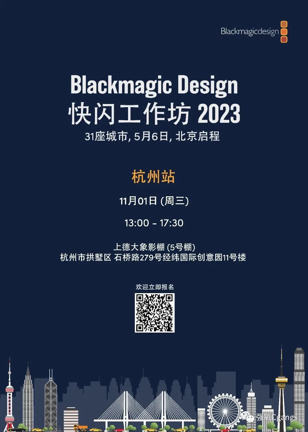 “扫描上方二维码即可报名活动”11月1日 · 杭州站-十一月伊始,Blackmagic Design将携最新影视制作技术和产品来到杭州,欢迎您报名参加我们的活动!杭州站 活动详情① 早鸟福利形式:签到处领取精美周边小礼品,先到先得内容:Bl