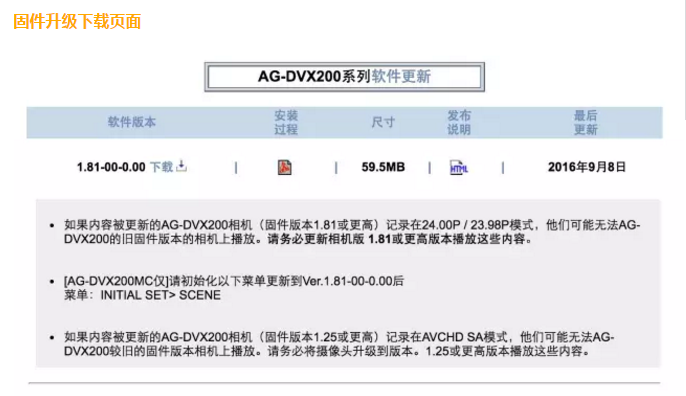 在中国一年一度的中秋佳节到来之际,小松也在这里提前预祝大家中秋快乐~同时,我们也为用户们带来好消息,AG-DVX200迎来新一轮的固件升级~本次升级版本为1.81,固件推出时间是2016年9月8日。 固件升级官网截图以上就是这次的更新信息,