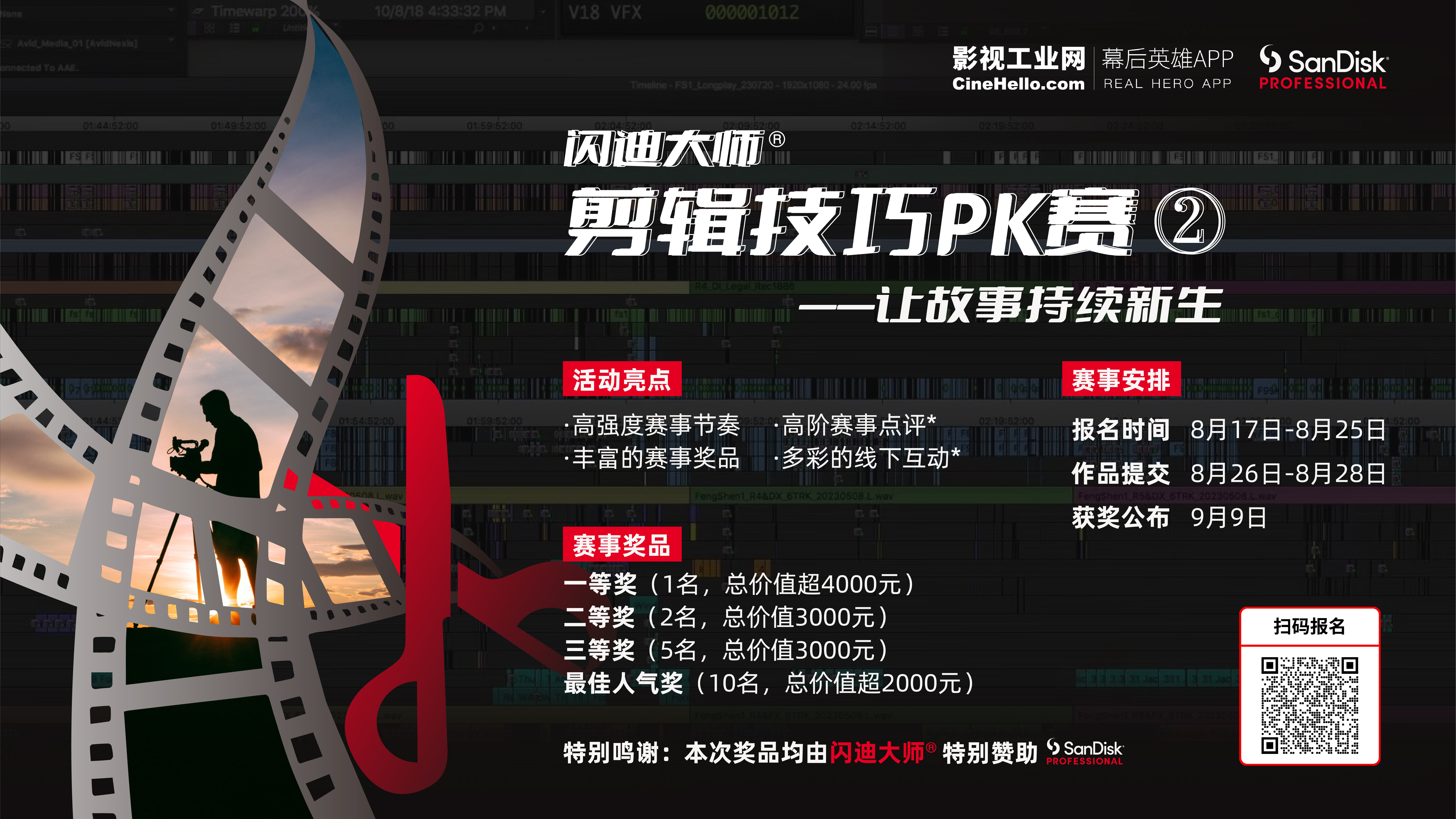 ??非常感谢大家对影视工业网第二届剪辑技巧PK赛的认可与支持截止到今天发稿,报名比赛人数已经近800人!再此感谢闪迪大师®对本次剪辑比赛奖品的大力支持希望闪迪大师的全系列存储解决方案能够为广大影视前后期工作者提供更全面的支持和帮助如果还没有