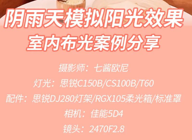 哈喽~欢迎来到思锐的布光实例分享下面由摄影师七酱欧妮,教大家如何在阴雨天气又没有阳光的民宿室内,利用思锐灯来模拟阳光效果~主灯:C150B双色温主灯选择的是思锐的C150B双色温摄影灯,通过调整色温和亮度,可以模拟日出阳光的感觉;这里我又加