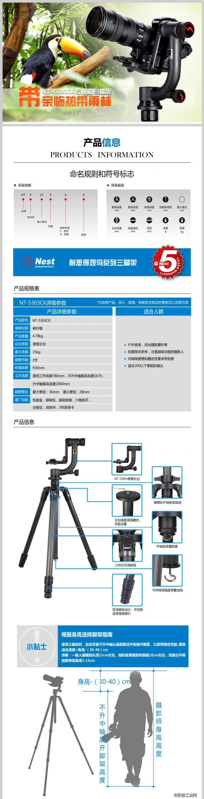 NEST耐思得5303CK碳纤维三脚架