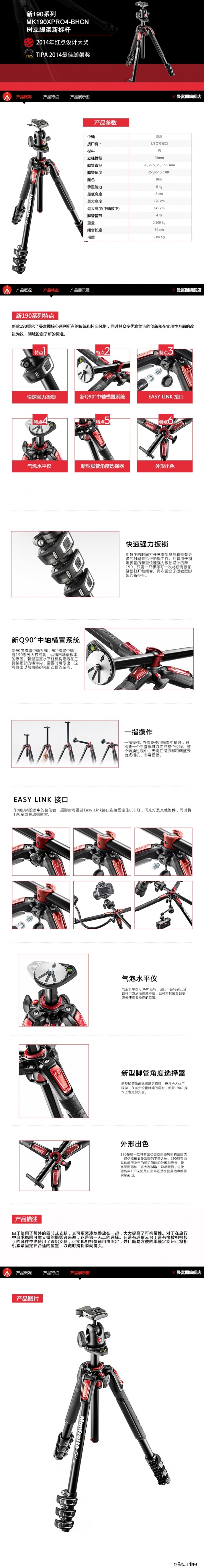曼富图新190系列铝合金四节脚架球形云台套装MK190XPRO4-BHCN