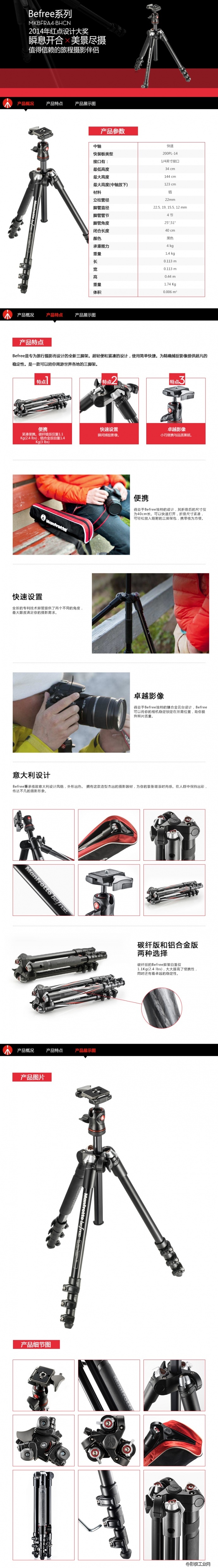 Manfrotto曼富图Befree系列MKBFRA4-BHCN铝合金三脚架套装