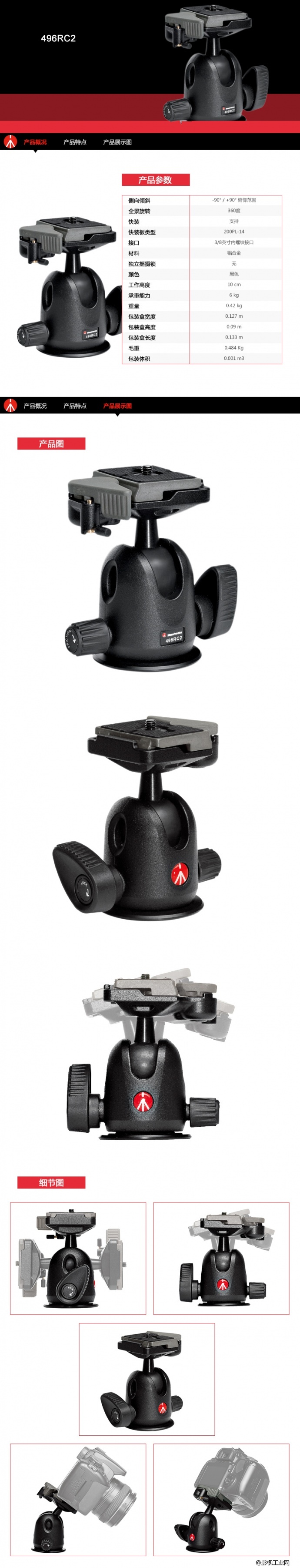 曼富图496RC2 单反相机铝合金球型云台带RC2快装板
