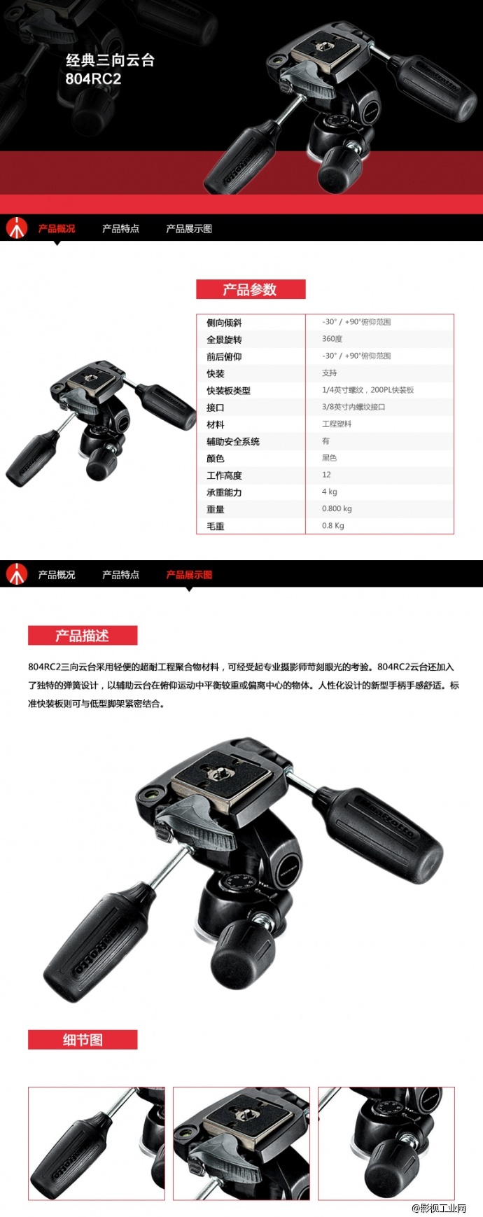 Manfrotto曼富图804RC2单反照相机摄影三脚架经典三向云台