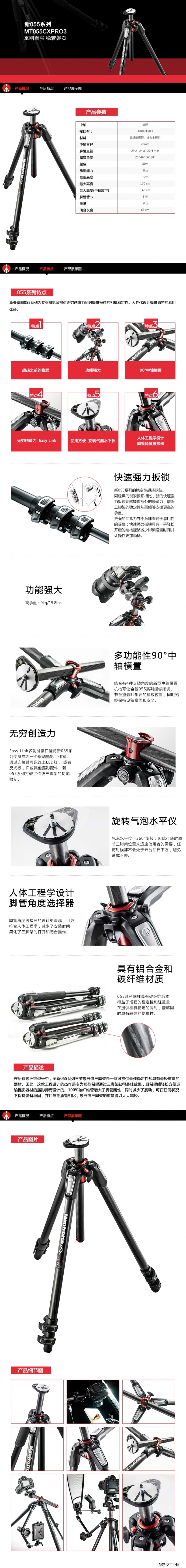 Manfrotto曼富图055系列MT055CXPRO3碳纤维单反照相机三脚架