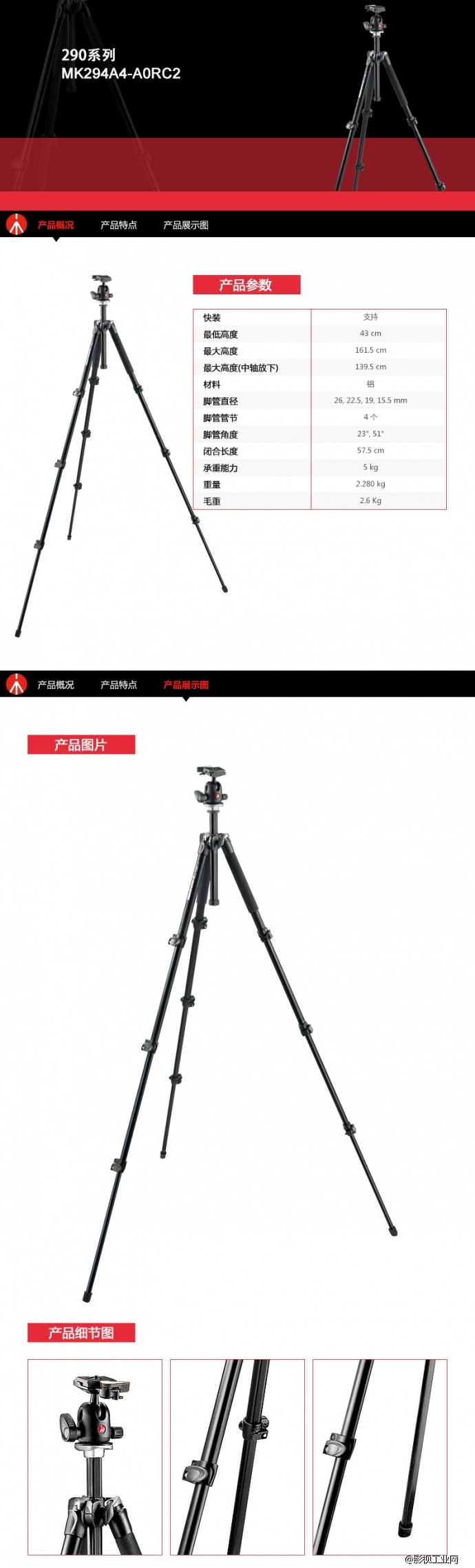 曼富图铝合金三脚架4节+球型云台套装(可分开)MK294A4-AORC2