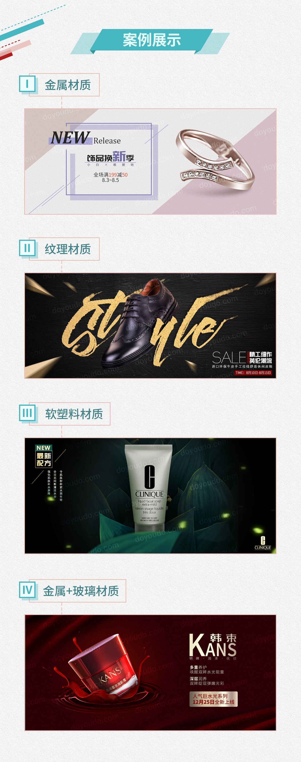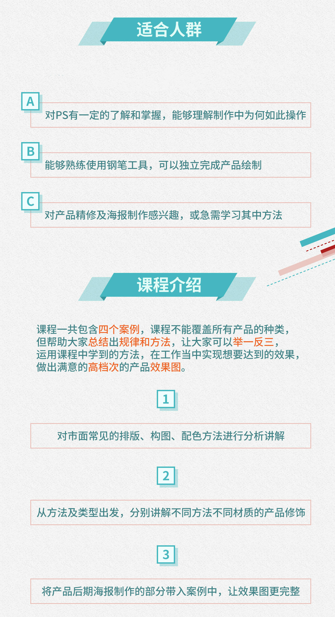1、对市面常见的排版、构图、配色方法进行分析讲解 2、从方法及类型出发,分别讲解不同方法不同材质的产品修饰 3、将产品后期海报制作的部分带入案例中,让效果图更完整 4、平均每集10分钟左右,说人话不拖沓,让学习更高效