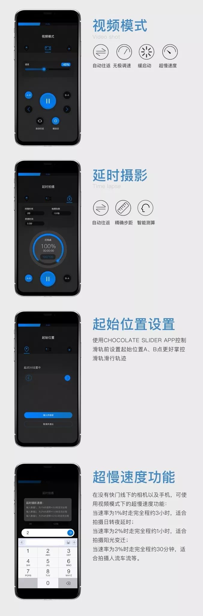 巧克力电动滑轨app提供视频模式与延时模式,只要设置AB点与必要参数,滑轨就可以开始运行并自动在AB点之间往返。巧克力电动滑轨通过快门线与相机连接,并可以通过APP控制相机的快门,设置好参数之后便可以拍摄唯美的移动延时视频啦!
