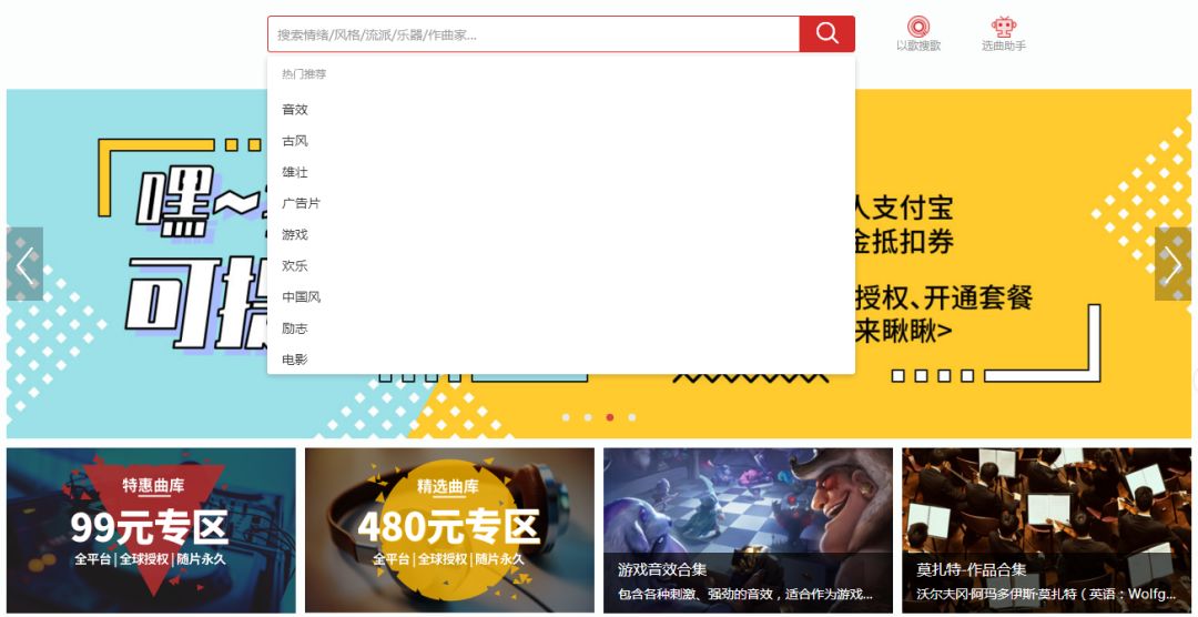 用户进入AGM官网,通过搜索功能,输入歌曲名、情绪、风格、流派、作曲家等信息,可以直接查找想要的歌曲;也可以通过首页左侧的标签栏,进行快速筛选。如果用户有歌曲文件,可以直接通过“以歌搜歌”功能查找相似歌曲。