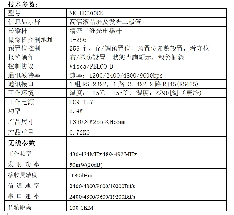 派尼珂Pnioke NK-WHD300CK高清会议摄像机控制键盘,采用三维光电精密摇杆,变速控制会议摄像机全方位匀速、变速转动,镜头变焦等功能。内置VISCA、 PELCO-D会议机协议,可控制SONY SRG-121DH、SRG-201SE、SRG-360SHE,松下、日立、中兴等品牌全系列会议摄像机,并具有高智能可编程和自定义编程模式,多功能信息菜单编程操作,独特的快捷键设置和操作模式,LED屏幕显示;设有 24个固定的快捷键自定义编程区,可将已设置的预置位直接储存在24个快捷键自定义编程区,在VISCA协议模式下作为VISCA常用菜单键来控制摄像机的菜单,菜单并能显示在LED屏幕上。支持松下、日立、汉锐、科达、中兴、华为高清1080P及4K会议摄像机无线远距离控制,无延迟,简单实用。