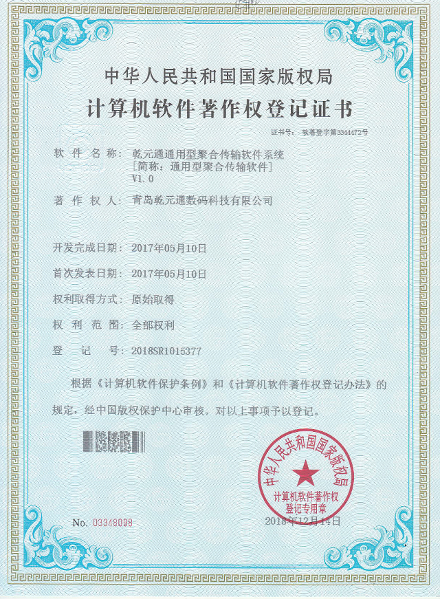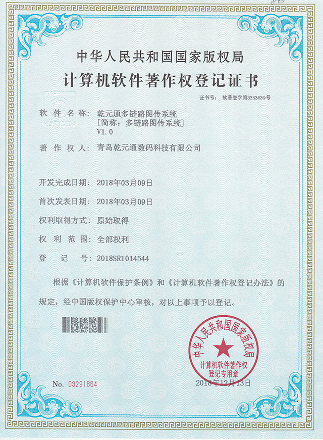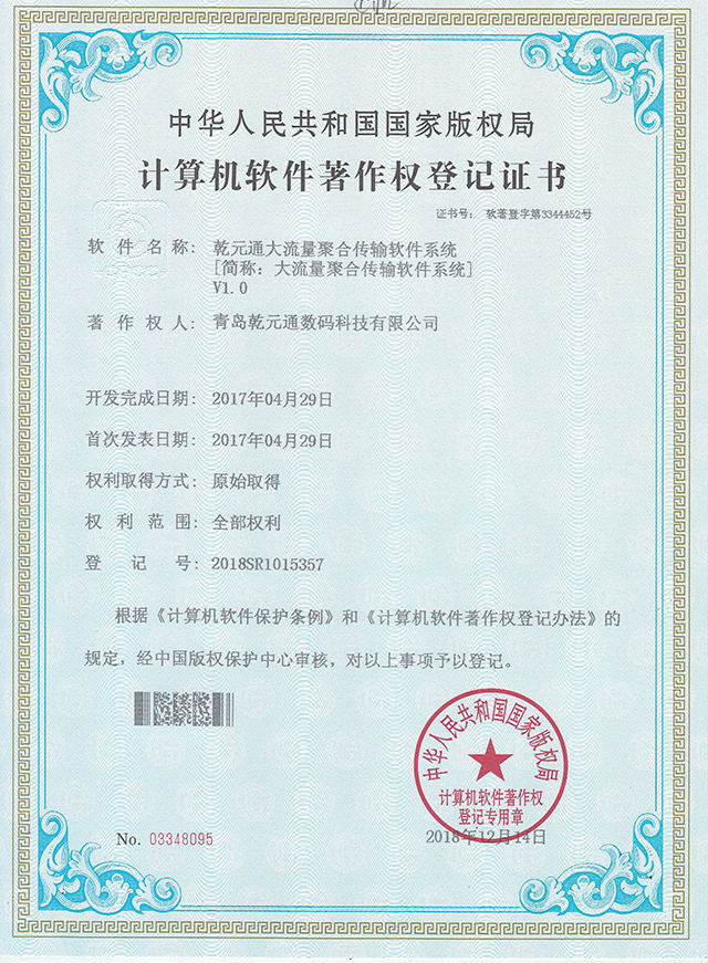 注重公司技术及软件的保护,积极审报专利及软件著作权。2018年12月获得“通用型聚合传输软件”、“大流量聚合传输软件系统”、“弱网聚合通讯保障系统”等6项软件著作权登记证书。