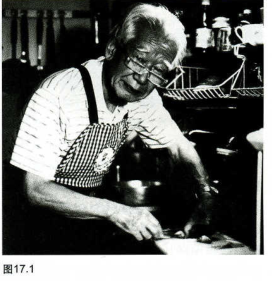正如我们已经说过的一样,实景拍摄的一大益处是更多地讲述照片中“真实”人物的能力。例如图17.1的照片是纽约摄影学院学生尤卡科·托萨(Yukako Tosa)拍摄的一幅人像。这幅实景人物题名为“系围裙的爷爷”,是在环境中如何运用道具的颇具说服力的范例,此例中的烹调用具、围裙、壶、锅以及动作等向我们讲述了这位被摄者的身份。注意,尤卡科如何成功地使其周围环境光线变暗来加强我们对这位老人的注意力。
